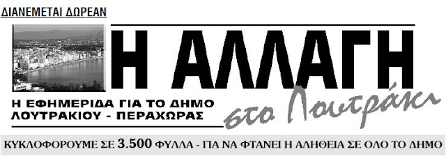 Η εφημερίδα “Η Αλλαγή στο Λουτράκι” χαιρετίζει την προσπάθεια που έχει κάνει η συντακτική ομάδα του Loutrakiblog και σας ανακοινώνει ότι από σήμερα, θα μπορείτε να διαβάζετε τα κείμενα της εφημερίδας και στο διαδικτυακό μας χώρο.