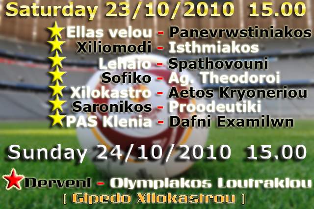 Αυτή είναι η επόμενη αγωνιστική του Α΄ Τοπικού Πρωταθλήματος Κορινθίας όπου ξεχωρίζει ο αγώνας της Κυριακής μεταξύ των ομάδων του Αστέρα Δερβενίου και του Ολυμπιακού Λουτρακίου, στο γήπεδο του Ξυλοκάστρου στις 3μ.μ.