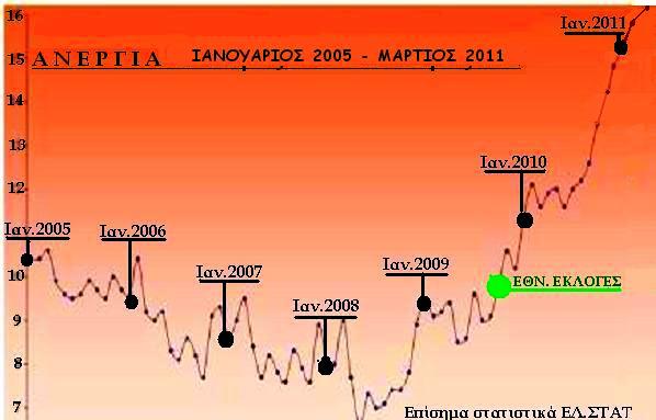 Το ποσοστό της ανεργίας τον Μάρτιο του 2011 αποτελεί ρεκόρ τουλάχιστον για την περίοδο από το 1983 μέχρι και σήμερα, όπως προκύπτει από τα στοιχεία του ΟΟΣΑ και της ΕΛΣΤΑΤ. Για την περίοδο 1983-2002 τα υψηλότερα ποσοστά ανεργίας είχαν καταγραφεί -βάσει των στατιστικών που διατηρεί ο ΟΟΣΑ- στη διετία 1999-2000, με τους εκτός εργασίας να αντιστοιχούν στο 12% του εργατικού δυναμικού.