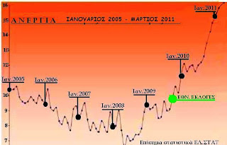 Μεταξύ Μαρτίου 2010 και 2011, επιπλέον 232.617 άτομα προστέθηκαν στις στρατιές των ανέργων. Πρόκειται για αύξηση της τάξης του 40,2% μέσα σε ένα έτος.