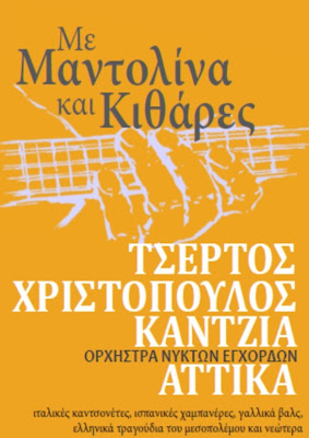 Στο πρόγραμμα “Με μαντολίνα και κιθάρες” η Ορχήστρα Νυκτών Εγχόρδων «ΑΤΤΙΚΑ» μας προσκαλεί σ’ ένα ταξίδι στη λεκάνη της Μεσογείου, με αναφορές σε Γαλλικά, Ισπανικά και Ελληνικά έντεχνα τραγούδια με μελωδίες των σπουδαιότερων Ελλήνων συνθετών Κ. Γιαννίδη, Ν. Χατζηαποστόλου, Μ. Σουγιούλ, Ν. Γούναρη, Μ. Χατζιδάκι και Μ. Θεοδωράκη.