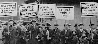 Το 1908 και με διαφορά 2 μηνών , ο Νικόλα Σάκο και ο Μπαρτολομέο Βαντσέτι μεταναστεύουν στις ΗΠΑ. Ο Νικόλα από το Τορεματζιόρε της νότιας Ιταλίας φτάνει τον Απρίλιο και ο Μπαρτολομέο από το Βιλαφαλέτο της βόρειας Ιταλίας φτάνει τον Ιούνιο. Οι δυό τους δεν γνωρίζονται. Ο Νικόλα δούλευε εργάτης σε βιομηχανία παπουτσιών , εργαζόταν 10 ώρες την ημέρα και 6 μέρες την εβδομάδα. Ηταν παντρεμένος με τη Ροζίνα Τζαμπέλι και είχε 2 παιδιά , τον Ντάντε και την Ινές.Ο Μπαρτολομέο έκανε πολλές δουλειές , ήταν ελεύθερο και ανεξάρτητο πνεύμα και μελετούσε Μαρξ , Ουγκό , Τολστόι , Δάντη , Ζολά , Δαρβίνο. Το 1916 πήρε ενεργό μέρος σε μία απεργία κατά της Πλίμουθ και από τότε δεν μπόρεσε να ξαναβρεί εργασία και αναγκάστηκε να κάνει τον ιχθυοπώλη. Εκείνη ήταν και η χρονιά που ο Νικόλα Σάκο και ο Μπαρολομέο Βαντσέτι γνωρίζονται και γίνονται μέλη μιας ομάδας ιταλοαμερικάνων αναρχικών. Ολη η ομάδα δραπετεύει στο Μεξικό για να αποφύγει την στράτευση ,(1ος παγκόσμιος πολεμος ), γιατί για έναν αναρχικό δεν υπήρχε κάτι χειρότερο από το να σκοτώσει ή να σκοτωθεί για το κράτος.