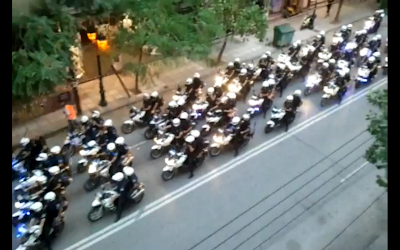 Τόσους μοτοσυκλετιστές της ΕΛ.ΑΣ. μαζεμένους δεν έχουμε ξαναδεί ποτέ σε αυτήν εδώ την πόλη. Το BINTEO τραβήχτηκε από το κτίριο της κατάληψης Libertatia, στην Λεωφόρο Στρατού στη Θεσσαλονίκη, μία ημέρα πριν από τα εγκαίνια της 76ης ΔΕΘ…