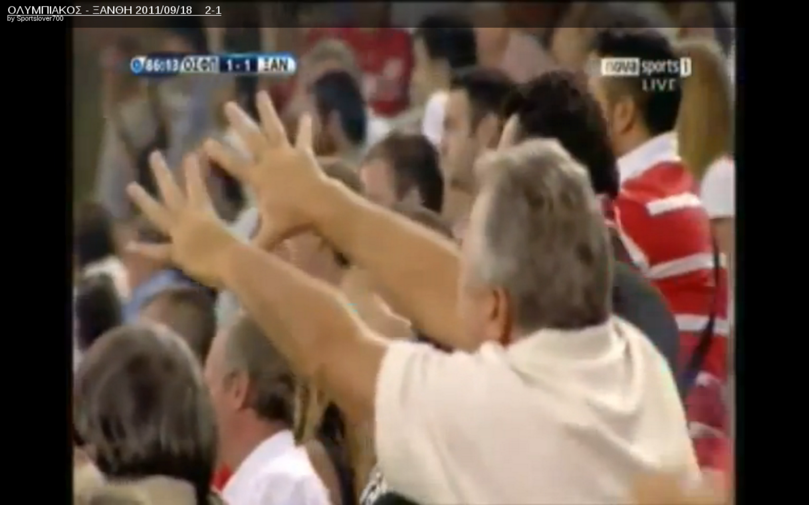 Δευτερόλεπτα πριν ο Μάρκο Πάντελιτς έχει κάνει το 1-1 για τους ερυθρόλευκους και η κάμερα του συνδρομητικού που μεταδίδει το παιχνίδι, ζουμάρει στην εξέδρα στο κομμάτι που βρίσκεται κάποια μέτρα πίσω από τον πάγκο του Ολυμπιακού και δεξιά.