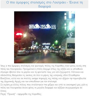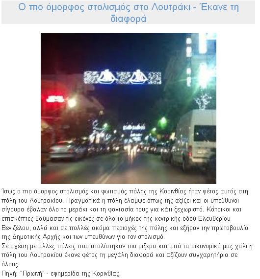 Διαβάζουμε στο επίσημο blog της παράταξης “Με τους πολίτες μπροστά” ότι ο πιο όμορφος στολισμός στο Λουτράκι, έκανε τη διαφορά σε όλο το δήμο Κορινθίας…