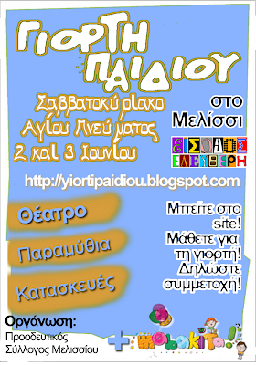 Σας περιμένουμε λοιπόν το Σαββατοκύριακο του Αγίου Πνεύματος, στις 2 και 3 Ιουνίου από τις 5:30 το απόγευμα, στο Άλσος της παραλίας του Μελισσίου Κορινθίας, για ένα διήμερο ξεγνοιασιάς, να κάνουμε κατασκευές, να ακούσουμε παραμύθια, να παρακολουθήσουμε θέατρο και πολλά άλλα.