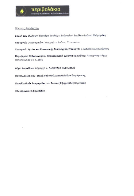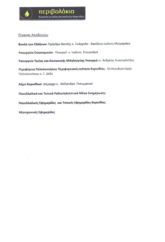 Πρόεδρο της Βουλής κ. Ευάγγελο – Βασίλειο Ιωάννη Μεϊμαράκη με αριθ. Πρωτ. 1699/27.7.2012, το Υπουργείο Οικονομικών υπόψιν του Υπουργού κ. Ιωάννη Στουρνάρα, το Υπουργείο Υγείας και Κοινωνικής Αλληλεγγύης υπόψιν του Υπουργού κ. Ανδρέας Λυκουρέντζος, τη Περιφέρεια Πελοποννήσου Περιφερειακή ενότητα Κορινθίας υπόψιν του Αντιπεριφερειάρχη Πελοποννήσου κ. Γεώργιο Δέδε με αριθ. Πρωτ. 349/19.7.2012 και τέλος το Δήμο Κορινθίων υπόψιν του Δημάρχου κ.