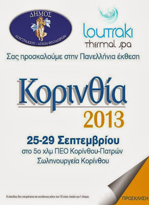στα πλαίσια της συνεχιζόμενης προσπάθειας για την προβολή και διαφήμιση των δυνατοτήτων του τουριστικού προορισμού και του εμπλουτισμένου τουριστικού προϊόντος της ευρύτερης περιοχής του Δήμου μας, καθώς και της προβολής των υπερσύγχρονων εγκαταστάσεων και των διαφοροποιημένων ποιοτικών υπηρεσιών του Υδροθεραπευτηρίου LOUTRAKI THERMAL SPA, θα συμμετέχει με δικό του εκθεσιακό περίπτερο στην 5η Πανελλήνια Γενική Έκθεση ‘’Κορινθία 2013’’, που θα πραγματοποιηθεί στις 25-29/9/2013 στο κτίριο πρώην «Σωληνουργεία Κορίνθου» (5ο χλμ. Π.Ε.Ο Κορίνθου – Πατρών, δίπλα στην αερογέφυρα Αρχαίας Κορίνθου).