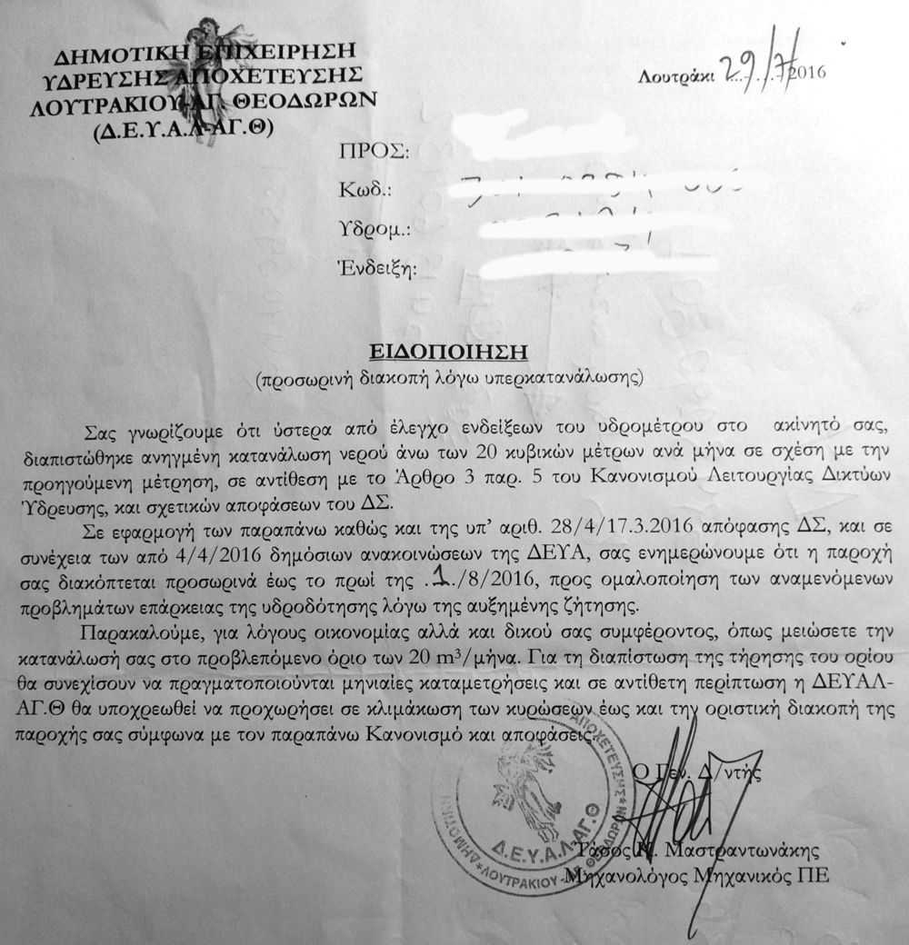 Με αυτό το χαρτάκι, κρυμμένο μέσα στο ρολόι του νερού, διακόπηκαν απροειδοποίητα οι παροχές του νερού σε όσους κατοίκους είχαν κάνει το “έγκλημα” να ξεπεράσουν ακόμα και για λίγα κυβικά μέτρα, τα 20 που αυθαίρετα έβαλε ως μηνιαίο όριο κατανάλωσης η Δημοτική Επιχείρηση Ύδρευσης..