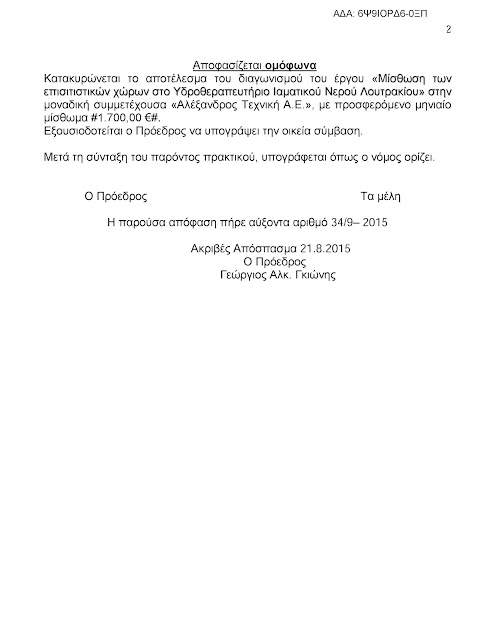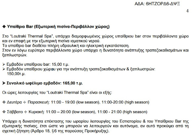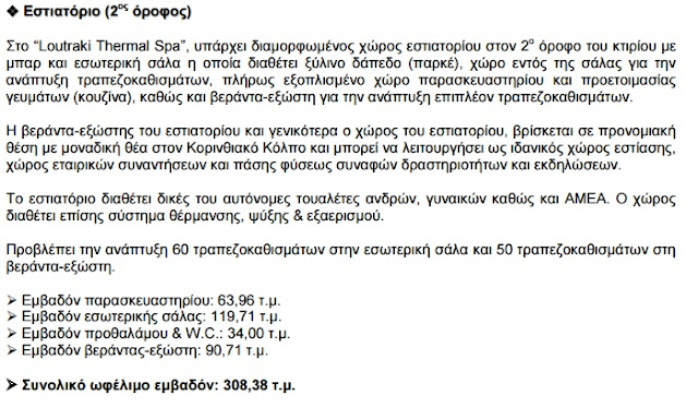 Το πρώτο χρονικά (21 Αυγούστου 2015), με μίσθωμα 1.700 ευρώ το μήνα, είναι όλοι οι επισιτιστικοί χώροι του Spa Λουτρακίου. Δείτε αναλυτικά τι πήρε η εταιρεία “Αλέξανδρος Τεχνική” με μίσθωμα 1700 το μήνα (ήτοι 3,16 ευρώ το τετραγωνικό)