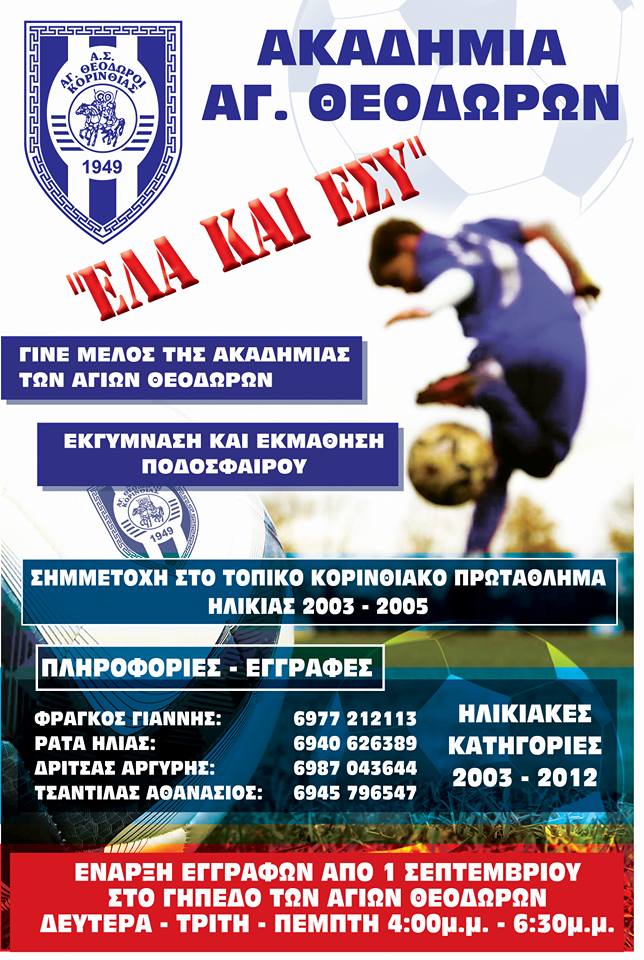 Μια ακόμη ποδοσφαιρική χρονιά ξεκινά στους Αγίους Θεοδώρους και αυτή τη στιγμή σκοπός της Ακαδημίας είναι να αποκτήσει τα νέα ποδοσφαιρικά ταλέντα του τόπου μας! Με τον αθλητισμό ευημερεί το πνεύμα και δυναμώνει τη σωματική ανάπλαση….