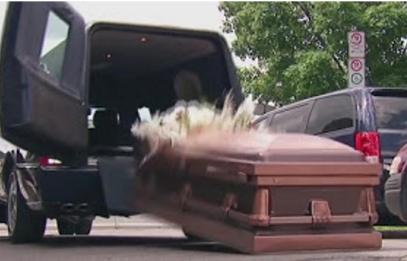 Λίγα χιλιόμετρα πριν φτάσουν στην ιδιαιτέρα πατρίδα του εκλιπόντος, ο οδηγός έχασε τον έλεγχο της νεκροφόρας, με αποτέλεσμα εκτός όλων των άλλων από την εκτροπή της νεκροφόρας να ανοίξει η πίσω πόρτα και το φέρετρο να εκτιναχθεί πολλά μέτρα μακριά με τη σορό να πετάγεται έξω από αυτό.