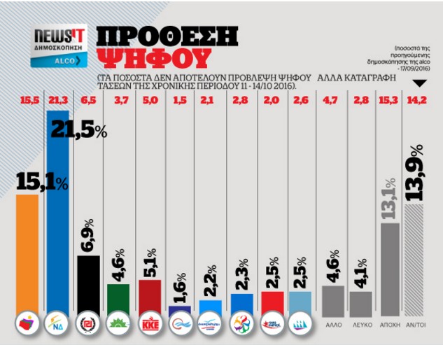 Στην δημοσκόπηση της Alco που έγινε για λογαριασμό του newsit.gr από τις 11 έως τις 14 Οκτωβρίου σε δείγμα 1.000 ατόμων προβλέπει: