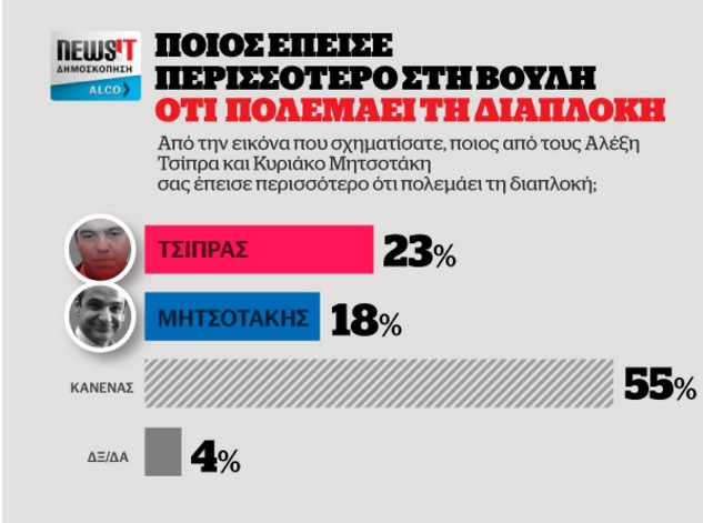 Στο ερώτημα, «Ποιος έπεισε περισσότερο στην Βουλή ότι πολεμάει την διαπλοκή», το 23% απαντά ο Αλέξης Τσίπρας, το 18% απαντά ο Κυριάκος Μητσοτάκης. Κανένας, απαντά το 55%.