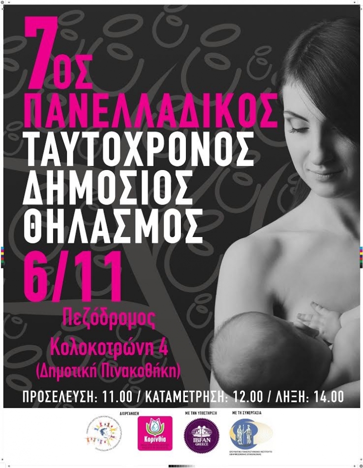 Όπως κάθε χρόνο, έτσι και φέτος για έβδομη χρονιά στο πλαίσιο του εορτασμού της Παγκόσμιας Εβδομάδας Μητρικού Θηλασμού, το Πανελλήνιο Δίκτυο Εθελοντικων Ομάδων….Υποστήριξης Μητρικού Θηλασμού και Μητρότητας, διοργάνωσε τον 7ο Πανελλήνιο Ταυτόχρονο Δημόσιο Θηλασμό με την εκδήλωση της στον Πεζόδρομο της Κορίνθου.
