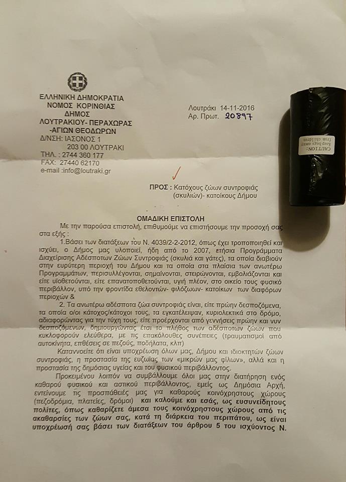 για τα κατοικίδια και 20  μικρά σακκουλάκια για την συλλογή των περιττωμάτων των μικρών μας φίλων,κατά τη διάρκεια του περιπάτου σε δημόσιους και κοινόχρηστους χώρους, έστειλε στους ιδιοκτήτες ζώων ο Αντιδήμαρχος καθαριότητας και πρασίνου κ. Σωτήρης Πέρρας.
