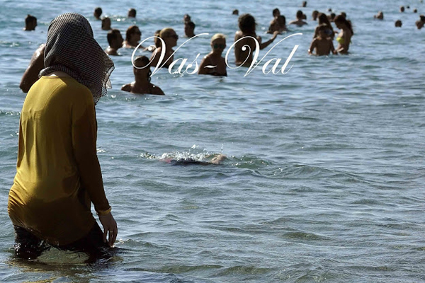 Η γυναίκα που κέντρισε το ενδιαφέρον (και πλήθος σχολίων όταν δημοσιεύσαμε τη φωτογραφία) στην παραλία του Λουτρακίου. Γιατί; Επειδή φορώντας τη μαντίλα, τη μπλούζα και το παντελόνι της, αποφάσισε να βουτήξει στα νερά του Κορινθιακού για να δροσιστεί.