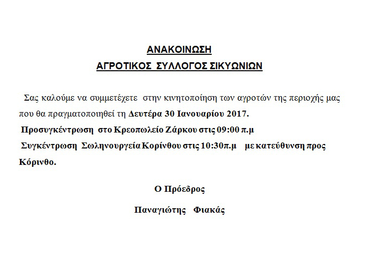 ΤΟΠΙΚΑΧωρίς κατηγορία Ανακοίνωση του αγροτικού συλλόγου Σικυωνίων για τις κινητοποιήσεις! 25 Ιανουαρίου 2017, 15:06 FacebookTwitterEmailCopy URLΤυπώνω - Advertisement - Δείτε την ανακοίνωση….. - Advertisement - ΕΤΙΚΕΤΕΣΤΟΠΙΚΑ ΑΦΗΣΤΕ ΜΙΑ ΑΠΑΝΤΗΣΗ Ακύρωση απάντησης Σχόλιο: εισάγετε το σχόλιό σας! Όνομα: παρακαλώ εισάγετε το όνομά σας εδώ Email: έχετε εισάγει εσφαλμένη διεύθυνση ηλεκτρονικού ταχυδρομείου! παρακαλώ εισάγετε εδώ την ηλεκτρονική σας διεύθυνση Ιστοσελίδα: αποθηκεύστε το όνομα, το ηλεκτρονικό ταχυδρομείο και τον ιστότοπό μου σε αυτό το πρόγραμμα περιήγησης για την επόμενη φορά που θα σχολιάσω. Δ Δείτε ακόμα ΤΟΠΙΚΑ Κορινθία: Δρομολόγια των Κινητών Αστυνομικών Μονάδων για αυτή την εβδομάδα Λουτράκι Βράβευση αριστούχων μαθητών Γυμνασίου και Λυκείου Λουτρακίου από το Νικολοπούλειο Ίδρυμα (ΦΩΤΟ) Ελλάδα Συμβουλές για αποφυγή χρήσης κροτίδων, βεγγαλικών και αυτοσχέδιων ειδών πυροτεχνίας Δημοτικά Συμβούλια Δήμος Σικυωνίων: Ματαίωση της 6ης Ειδικής συνεδρίασης Λογοδοσίας της δημοτικής αρχής μηνών Νοεμβρίου – Δεκεμβρίου 2025 Ελλάδα Οι αγρότες παραμένουν – Μια ματιά στα μπλόκα Σχετικά άρθρα ΤΟΠΙΚΑ Κορινθία: Δρομολόγια των Κινητών Αστυνομικών Μονάδων για αυτή την εβδομάδα Λουτράκι Βράβευση αριστούχων μαθητών Γυμνασίου και Λυκείου Λουτρακίου από το Νικολοπούλειο Ίδρυμα (ΦΩΤΟ) Δημοτικά Συμβούλια Δήμος Σικυωνίων: Ματαίωση της 6ης Ειδικής συνεδρίασης Λογοδοσίας της δημοτικής αρχής μηνών Νοεμβρίου – Δεκεμβρίου 2025 Λουτράκι Λουτράκι: Πρόσκληση Εορτασμού της 1ης του Νέου Έτους 2026