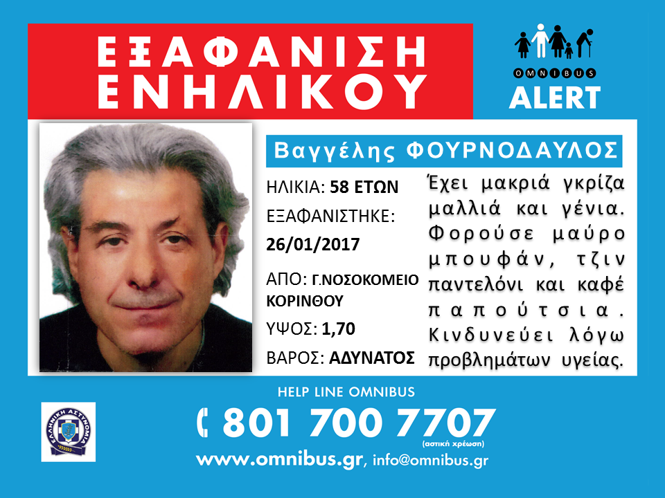 Ο 58χρονος Βαγγέλης ΦΟΥΡΝΟΔΑΥΛΟΣ εξαφανίστηκε στις 26/01/17 ύστερα από εξιτήριο που έλαβε από το Γ.Ν. Κορίνθου, όπου νοσηλευόταν λόγω βρογχίτιδας από τις 24/01/17…