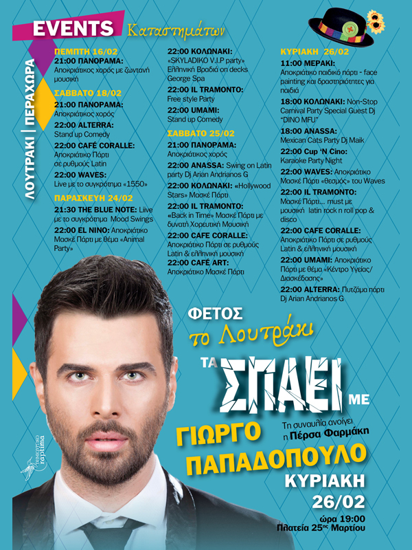 Αυτό το "events" και όλους τους λοιπούς αγγλισμούς που έχει υιοθετήσει η τουριστική βιομηχανία της πόλης μας (!!!) με "σκοτώνει". Μας χαλάει το Image να πούμε "εκδηλώσεις"!