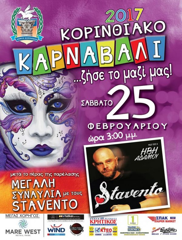 Ο Δήμος Κορινθίων σε συνεργασία με το Κέντρο Πολιτισμού Αθλητισμού & Περιβάλλοντος διοργανώνουν και φέτος το Σάββατο στις 25 Φεβρουαρίου 2017 στις 3.00 μ.μ. μεγάλη καρναβαλική παρέλαση με την συμμετοχή χιλιάδων καρναβαλιστών και αρμάτων….