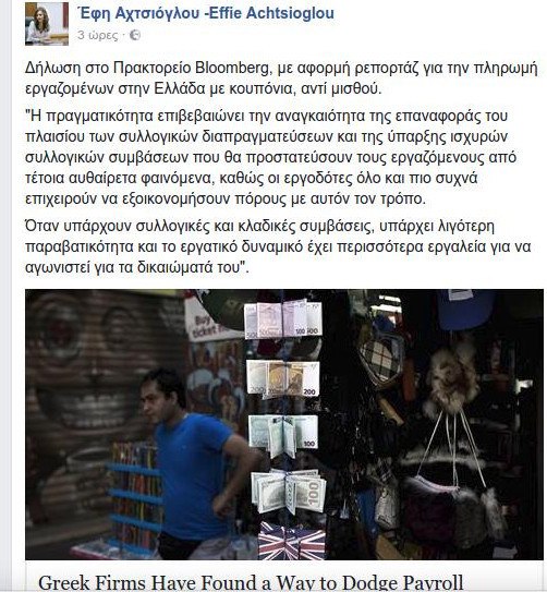 Επιβεβαίωσε το ρεπορτάζ του πρακτορείου Bloomberg η υπουργός Εργασίας Εφη Αχτσιόγλου περί πληρωμής εργαζομένων στην Ελλάδα με κουπόνια, αντί μισθού….