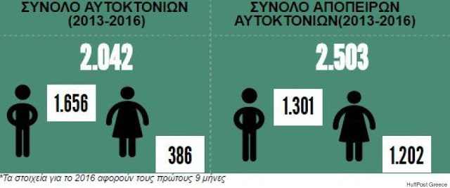 Την ίδια στιγμή χιλιάδες είναι και οι γυν αίκες που εκδηλώνουν την πρόθεσή τους να βάλουν οι ίδιες τέλος στη ζωή τους, με συνολικά 1.301 να έχουν διαπράξει απόπειρα αυτοκτονίας κατά το 2013-2016