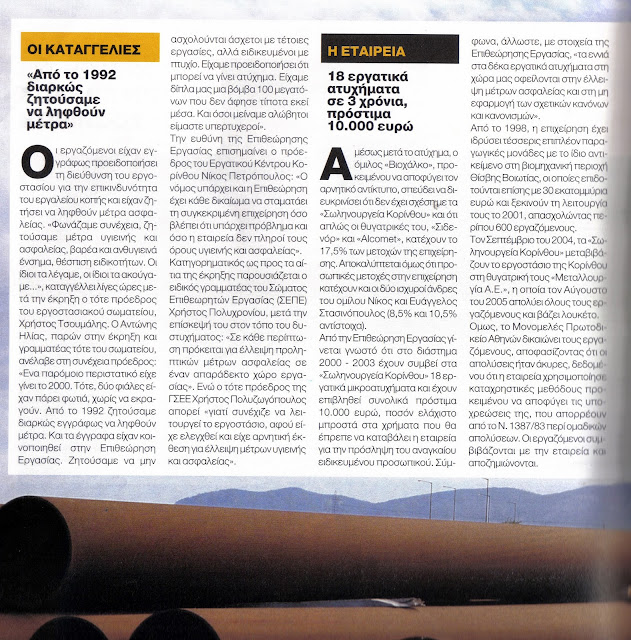 Τον Απρίλη του 2003, έξι εργάτες σκοτώθηκαν στο εργοστάσιο της Σωληνουργίας Κορίνθου και αρκετοί τραυματίστηκαν σοβαρά, σ’ ένα εργατικό ατύχημα που παρόμοιό του σε μέγεθος και φρίκη δεν έχει συμβεί στον νομό μας. Χωρίς όμως να είναι το πρώτο αλλά ούτε και το τελευταίο εργατικό «ατύχημα», πήρε τον δρόμο της δικαιοσύνης, με τον γνωστό τυπικό και υποδειγματικό θεσμικό τρόπο που υποδεικνύεται για τις αντίστοιχες περιπτώσεις των αποκαλούμενων «εργατικών ατυχημάτων».