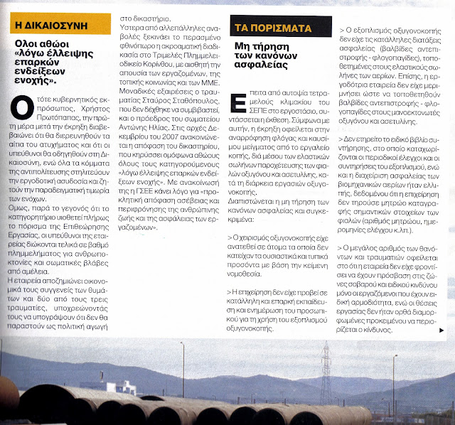 Το Νοέμβριο του 2007 μείναμε άφωνοι από την απόφαση του δικαστηρίου να αθωώσει τη ΣΩΛΗΝΟΥΡΓΙΑ Α.Ε. και να μην αποδώσει καμμία ευθύνη στην εταιρεία για το πολύνεκρο «ατύχημα» του 2003. Η κατά τα άλλα λαλίστατη κορινθιακή κοινωνία, αντί να κραυγάσουμε για την εξόφθαλμη στρεψοδικία, κουνήσαμε τα κεφάλια και συνεχίσαμε την καθημερινότητα μας. Αδιαφορώντας άλλη μια φορά για το τι συμβαίνει δίπλα μας.