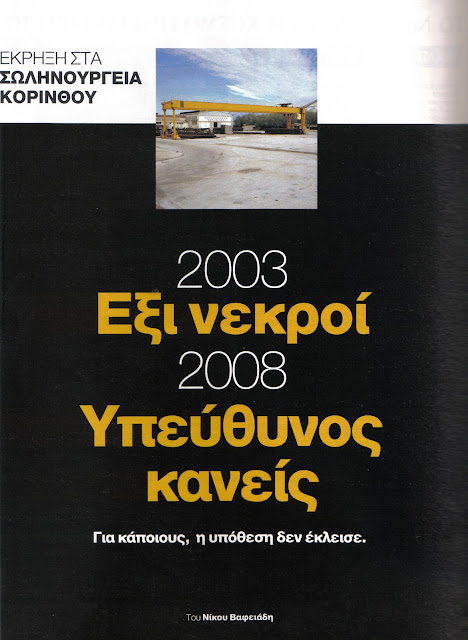 Τον Απρίλη του 2003, έξι εργάτες σκοτώθηκαν στο εργοστάσιο της Σωληνουργίας Κορίνθου και αρκετοί τραυματίστηκαν σοβαρά, σ’ ένα εργατικό ατύχημα που παρόμοιό του σε μέγεθος και φρίκη δεν έχει συμβεί στον νομό μας. Χωρίς όμως να είναι το πρώτο αλλά ούτε και το τελευταίο εργατικό «ατύχημα», πήρε τον δρόμο της δικαιοσύνης, με τον γνωστό τυπικό και υποδειγματικό θεσμικό τρόπο που υποδεικνύεται για τις αντίστοιχες περιπτώσεις των αποκαλούμενων «εργατικών ατυχημάτων».