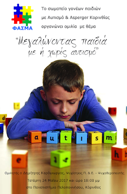 Το Σωματείο Φάσμα Γονέων παιδιών με Αυτισμό & Asperger Κορινθίας οργανώνει την πρώτη του εκδήλωση την Τετάρτη 24 Μαΐου στις 18:00 ο γνωστός Ψυχίατρος π & ε και ψυχοθεραπευτής Δημήτρης Καράγιωργας θα μιλήσει στο Πανεπιστήμιο Πελοποννήσου στη Κόρινθο με θέμα «Μεγαλώνοντας παιδιά με ή χωρίς Αυτισμό»…