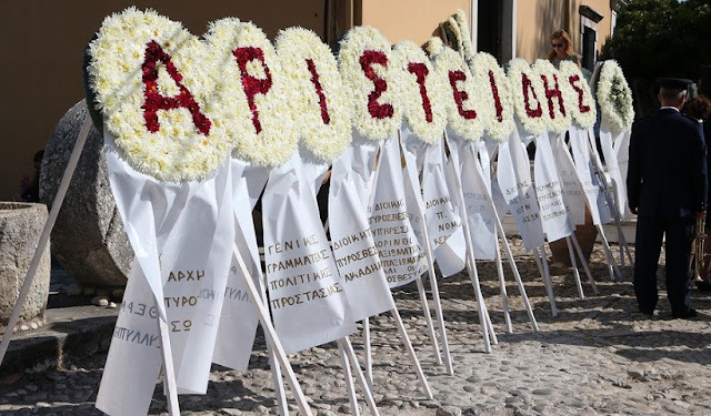 Στεφάνια κατατέθηκαν εκ μέρους του πρωθυπουργού Αλέξη Τσίπρα, του υπουργείου Προστασίας του Πολίτη, του Πυροσβεστικού Σώματος, της Αυτοδιοίκησης και των πολιτικών Αρχών του τόπου.