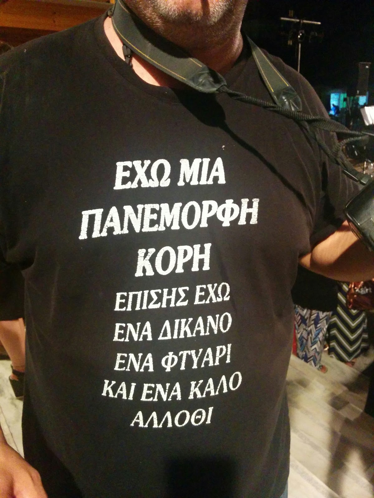 “Mε συγχωρείτε αλλά αυτός ο τύπος εδώ είναι ωραίος. Η μπλούζα του γράφει : Eχω μια πανέμορφη κόρη, επίσης έχω ένα δίκανο, ένα φτυάρι και ένα καλό άλλοθι…Οκ… Μόνο μη γνωρίσεις το γιο μου….. !!!!” προκαλώντας τα χειροκροτήματα και τα γέλια του κόσμου !!
