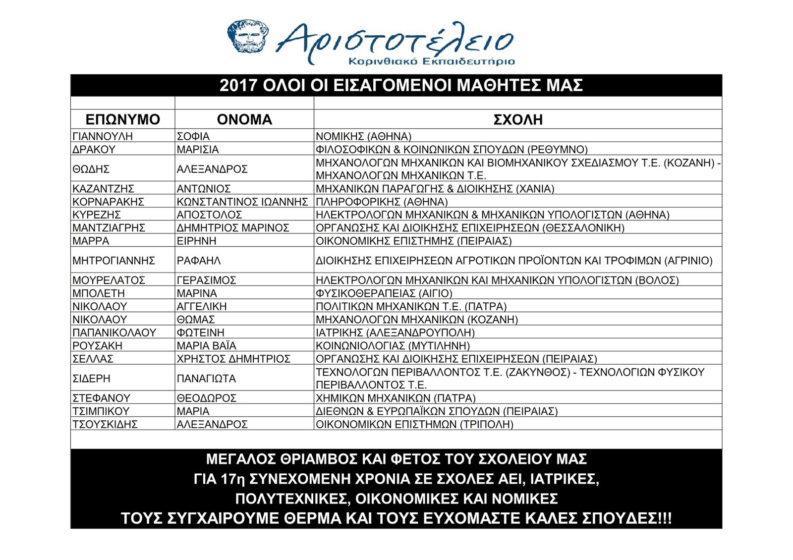 ΤΟΠΙΚΑΧωρίς κατηγορία ΠΑΝΕΛΛΗΝΙΕΣ:Oι επιτυχόντες του Αριστοτελείου Κορινθιακού Εκπαιδευτηρίου 24 Αυγούστου 2017, 20:52 FacebookTwitterEmailCopy URLΤυπώνω - Advertisement - ΜΕΓΑΛΟΣ ΘΡΙΑΜΒΟΣ ΚΑΙ ΦΕΤΟΣ ΤΟΥ ΣΧΟΛΕΙΟΥ ΜΑΣ ΓΙΑ 17η ΣΥΝΕΧΟΜΕΝΗ ΧΡΟΝΙΑ ΣΕ ΣΧΟΛΕΣ ΑΕΙ, ΙΑΤΡΙΚΕΣ, ΠΟΛΥΤΕΧΝΙΚΕΣ, ΟΙΚΟΝΟΜΙΚΕΣ ΚΑΙ ΝΟΜΙΚΕΣ. ΣΑΣ ΣΥΓΧΑΙΡΟΥΜΕ ΘΕΡΜΑ ΚΑΙ ΣΑΣ ΕΥΧΟΜΑΣΤΕ ΚΑΛΕΣ ΣΠΟΥΔΕΣ!!!… - Advertisement - ΕΤΙΚΕΤΕΣΤΟΠΙΚΑ ΑΦΗΣΤΕ ΜΙΑ ΑΠΑΝΤΗΣΗ Ακύρωση απάντησης Σχόλιο: εισάγετε το σχόλιό σας! Όνομα: παρακαλώ εισάγετε το όνομά σας εδώ Email: έχετε εισάγει εσφαλμένη διεύθυνση ηλεκτρονικού ταχυδρομείου! παρακαλώ εισάγετε εδώ την ηλεκτρονική σας διεύθυνση Ιστοσελίδα: αποθηκεύστε το όνομα, το ηλεκτρονικό ταχυδρομείο και τον ιστότοπό μου σε αυτό το πρόγραμμα περιήγησης για την επόμενη φορά που θα σχολιάσω. Δ Δείτε ακόμα Ελλάδα Βριλήσσια: Την παρέσυρε με το αμάξι του επειδή τσακώθηκαν για το δέμα! Λουτράκι Θρήνος στο Λουτράκι για τον ξαφνικό θάνατο της Σταυρούλας Τσάμη-Παντελέων Κορινθία Της…σκαλωσιάς το κάγκελο στο Ξυλόκαστρο! Λουτράκι Λουτράκι: Εγκαίνια του Πολιτιστικού Κέντρου των Αγίων Θεοδώρων Λουτράκι Δυναμική παρουσία του Α.Ο. Ποσειδών Λουτρακίου στην Ημερίδα Στίβου της Πάτρας Σχετικά άρθρα Λουτράκι Θρήνος στο Λουτράκι για τον ξαφνικό θάνατο της Σταυρούλας Τσάμη-Παντελέων Κορινθία Της…σκαλωσιάς το κάγκελο στο Ξυλόκαστρο! Λουτράκι Λουτράκι: Εγκαίνια του Πολιτιστικού Κέντρου των Αγίων Θεοδώρων Λουτράκι Δυναμική παρουσία του Α.Ο. Ποσειδών Λουτρακίου στην Ημερίδα Στίβου της Πάτρας