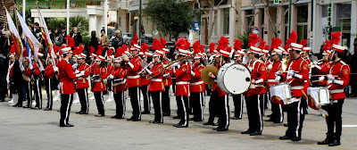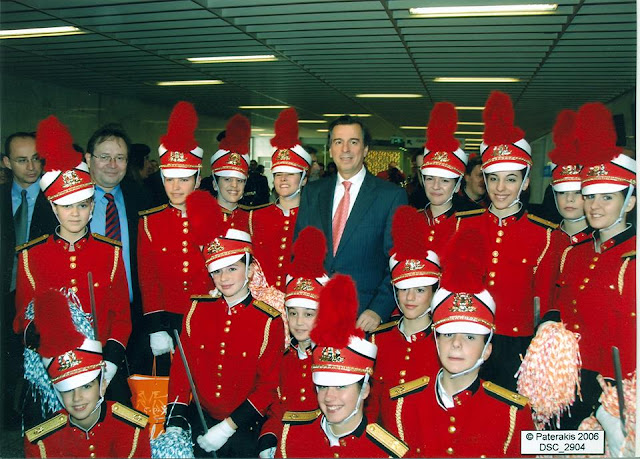 | Ο υπουργός πολιτισμού Μιχάλης Λιάπης στο Σύνταγμα με το Μαέστρο Χρήστο Καλούδη και τις Μαζορέτες της Φιλαρμονικής. |