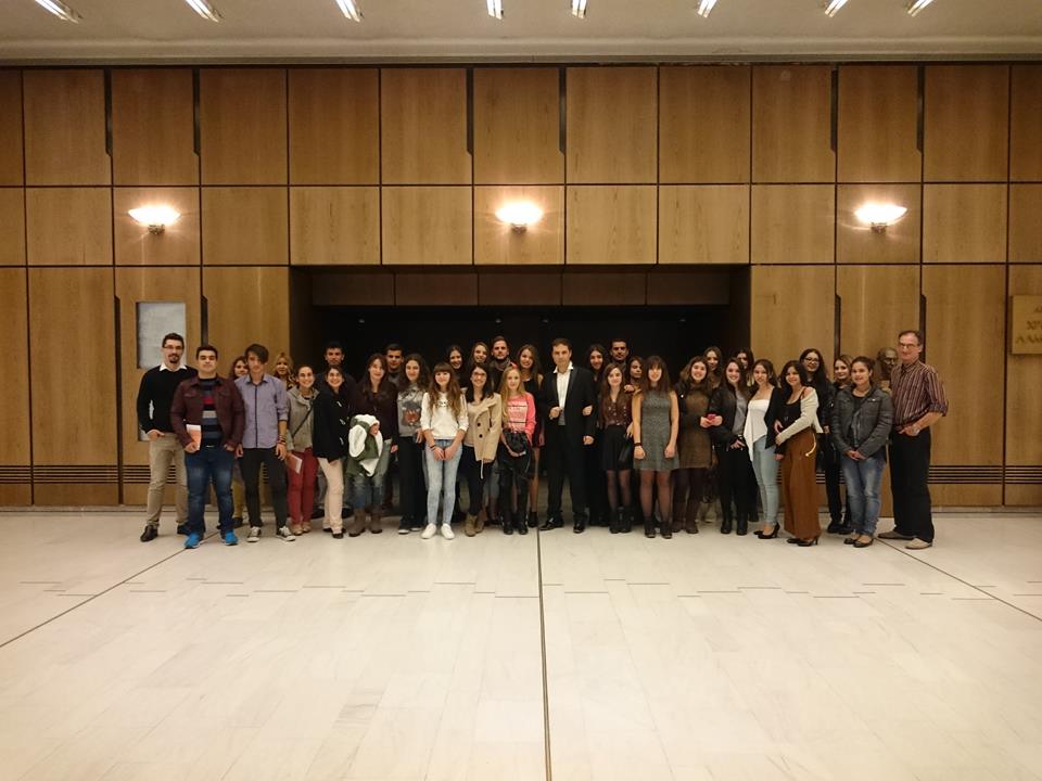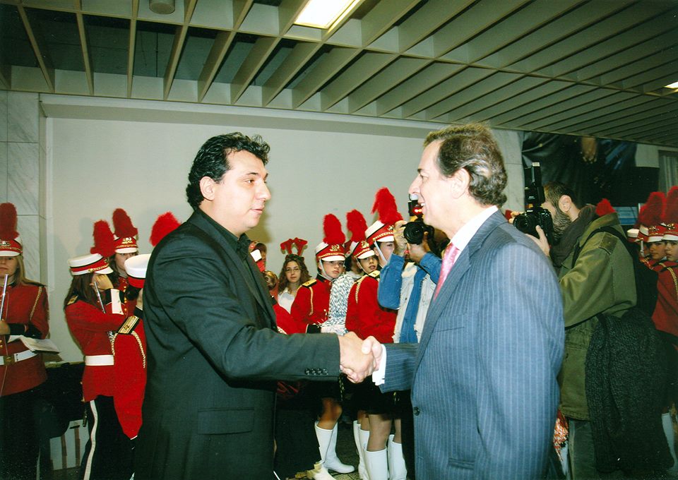 | Ο υπουργός πολιτισμού Μιχάλης Λιάπης στο Σύνταγμα με το Μαέστρο Χρήστο Καλούδη και τις Μαζορέτες της Φιλαρμονικής. |
