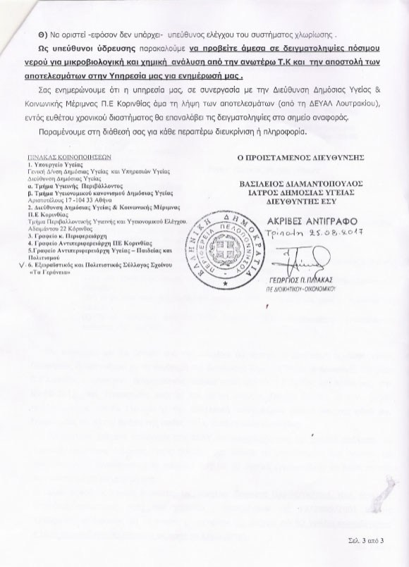Αυτή είναι η από 25/08/2017 επιστολή της Διεύθυνσης Δημόσιας Υγείας της Περιφέρειας με Αριθ. Πρωτ. 216523/49666, που αφορά στον ποιοτικό έλεγχο του πόσιμου νερού στο Σχίνο, Κορινθίας στις 9/8/17…..
