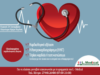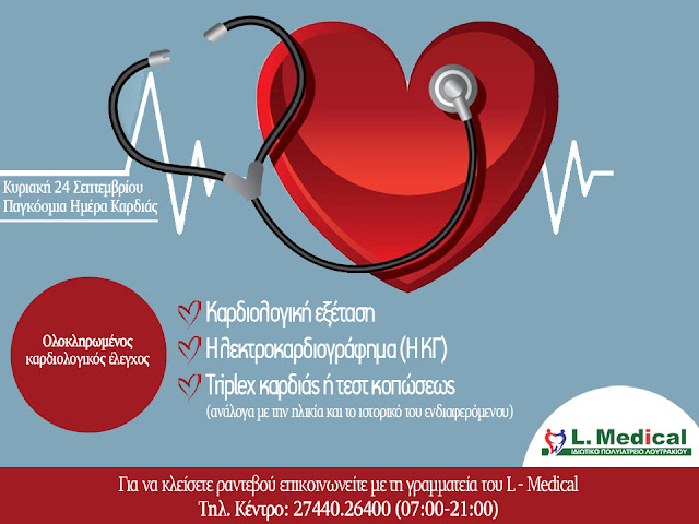 Με αφορμή την Παγκόσμια Ημέρα Καρδιάς (Κυριακή 24 Σεπτεμβρίου), το L.Medical, προσφέρει Ολοκληρωμένο Καρδιολογικό Έλεγχο σε πολύ προνομιακή τιμή, η οποία περιλαμβάνει: