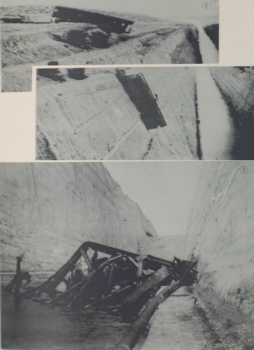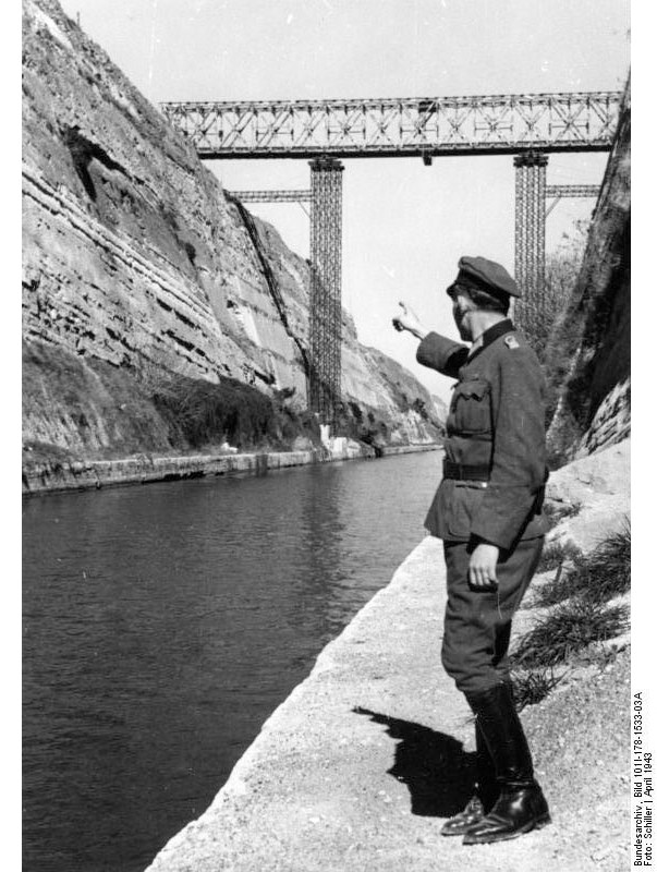Η ανατίναξη της Διώρυγας από τις γερμανικές δυνάμεις το 1944, κατά τη διάρκεια της αποχωρησής τους. Βλ. HyperWar- The German Campaigns in the Balkans (Spring 1941)–Part III,