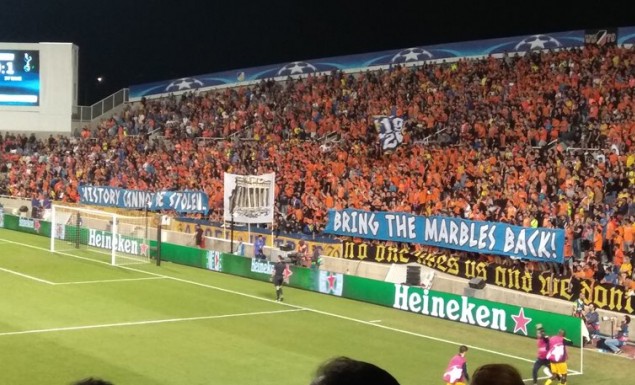 Κατά τη διάρκεια του αγώνα ΑΠΟΕΛ-Τότεναμ για την 2η αγωνιστική των ομίλων του Champions League οι Κύπριοι οπαδοί ύψωσαν στις εξέδρες του ΓΣΠ πανό για τα Μάρμαρα του Παρθενώνα.