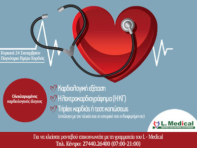 Με αφορμή την Παγκόσμια Ημέρα Καρδιάς, το L.Medical, προσφέρει Ολοκληρωμένο Καρδιολογικό Έλεγχο σε πολύ προνομιακή τιμή, η οποία περιλαμβάνει: