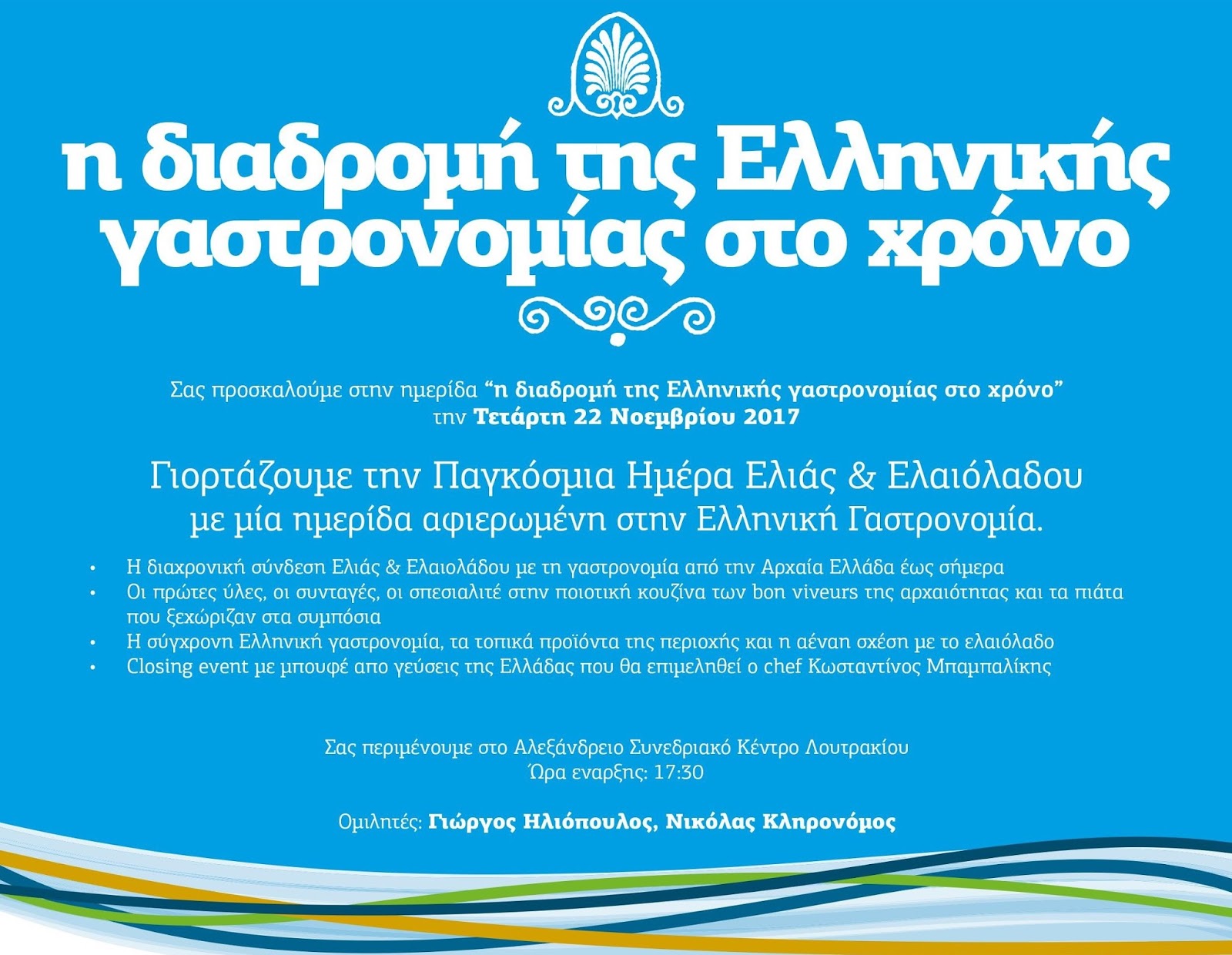 Ο Τουριστικός Οργανισμός Λουτρακίου υποστηρίζει ως συνδιοργανωτής την θεματική ημερίδα με τίτλο “Η διαδρομή της Ελληνικής Γαστρονονμίας στο χρόνο” …