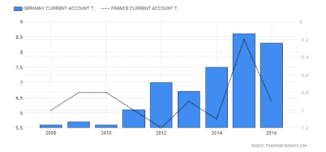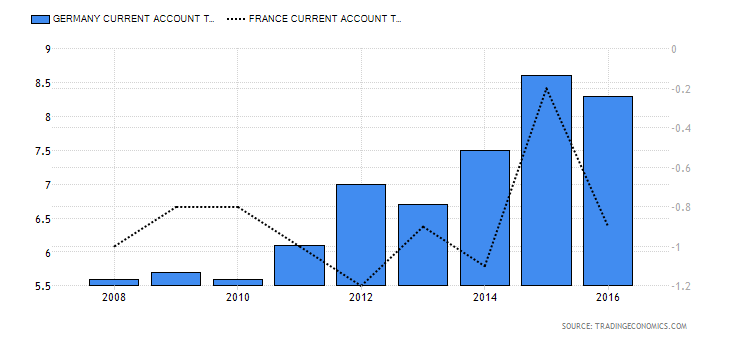 Επεξήγηση γραφήματος: Εξέλιξη των πλεονασμάτων του ισοζυγίου τρεχουσών συναλλαγών της Γερμανίας (μπλε στήλες, αριστερή κάθετος, +8,5% το 2016 ή περί τα 300 δις $), σε σύγκριση με τη Γαλλία (διακεκομμένη γραμμή, δεξιά κάθετος, -1% το 2016), η οποία βιώνει σήμερα τη στασιμότητα της φτώχειας και της δυστυχίας (πηγή: Le Monde).