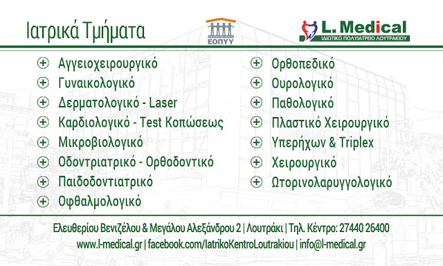 Για προγραμματισμό ραντεβού, επικοινωνήστε με τη γραμματεία του L-Medical στο τηλ. 27440. 26400 (Δευτέρα έως Παρασκευή 07:00 – 21:00 και Σάββατο 07:00 – 15:00)