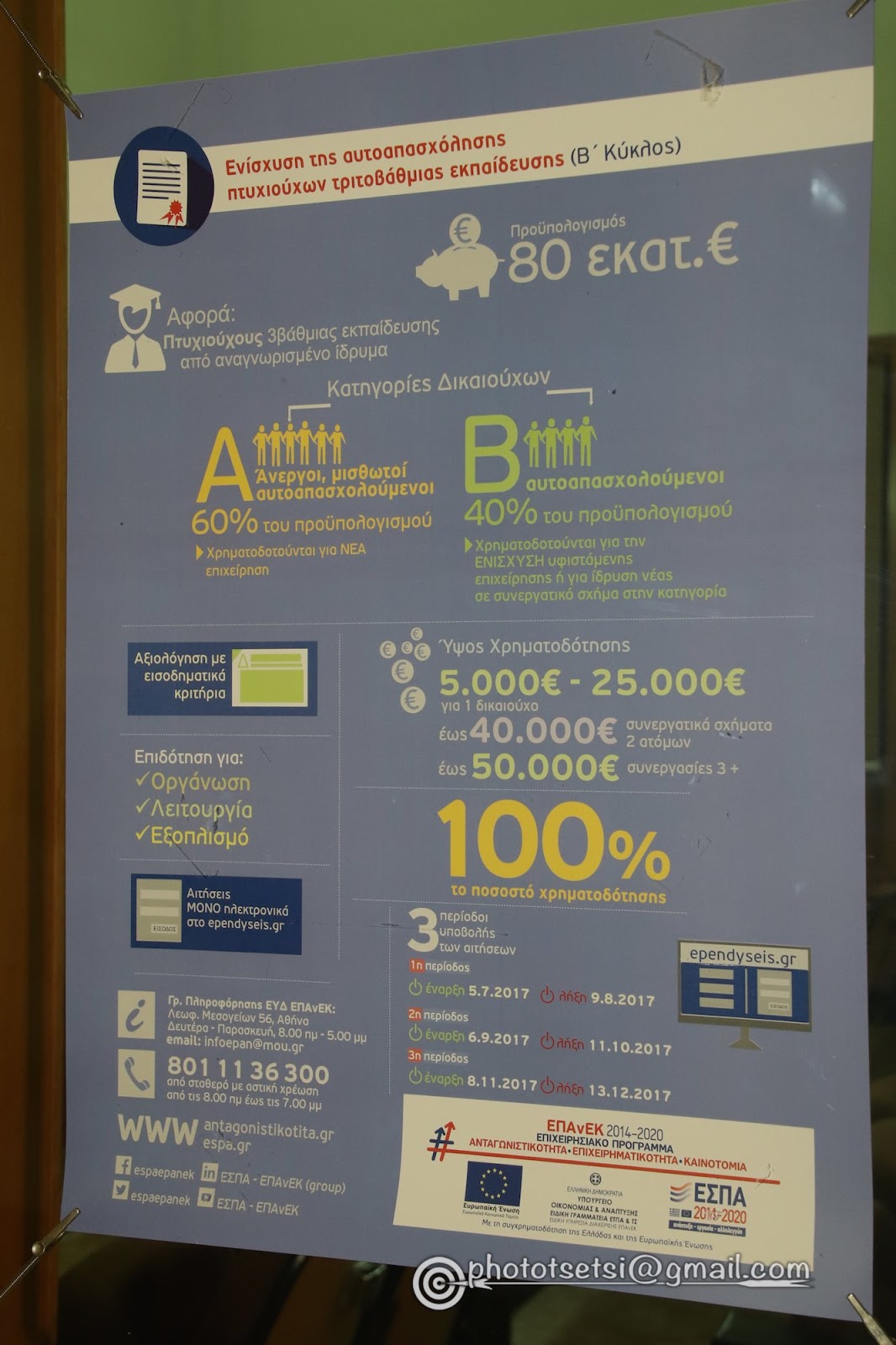ανοιχτή ενημερωτική εκδήλωση, στον χώρο του Επιμελητηρίου, με τα εξής θέματα: α. “Ενίσχυση της αυτοαπασχόλησης πτυχιούχων τριτοβάθμιας εκπαίδευσης (Β΄κύκλος)” του ΕΠΑνΕΚ και β. “Ενίσχυση της Ίδρυσης και Λειτουργίας Νέων Τουριστικών Μικρομεσαίων Επιχειρήσεων”.