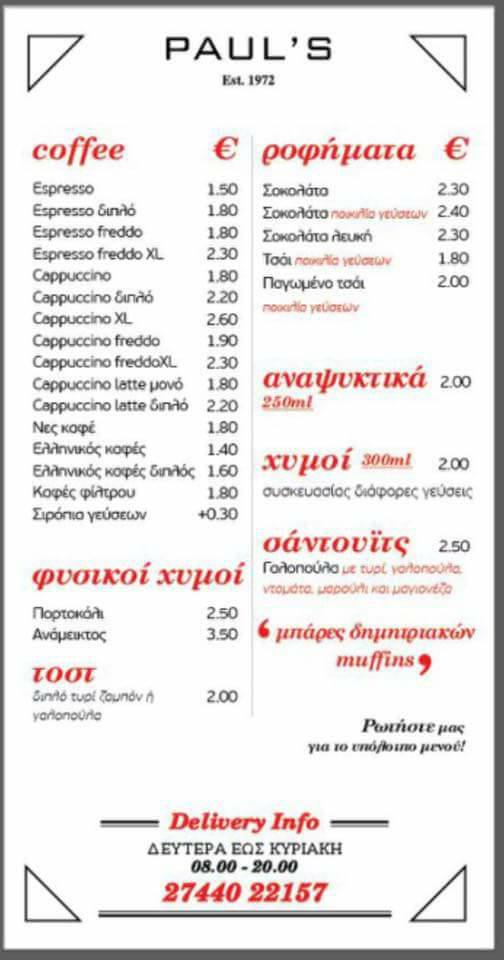 Από τη Δευτέρα 27 Νοεμβρίου, το Cafe Paul’s παρέχει στους φίλους και πελάτες την υπηρεσία Delivery..