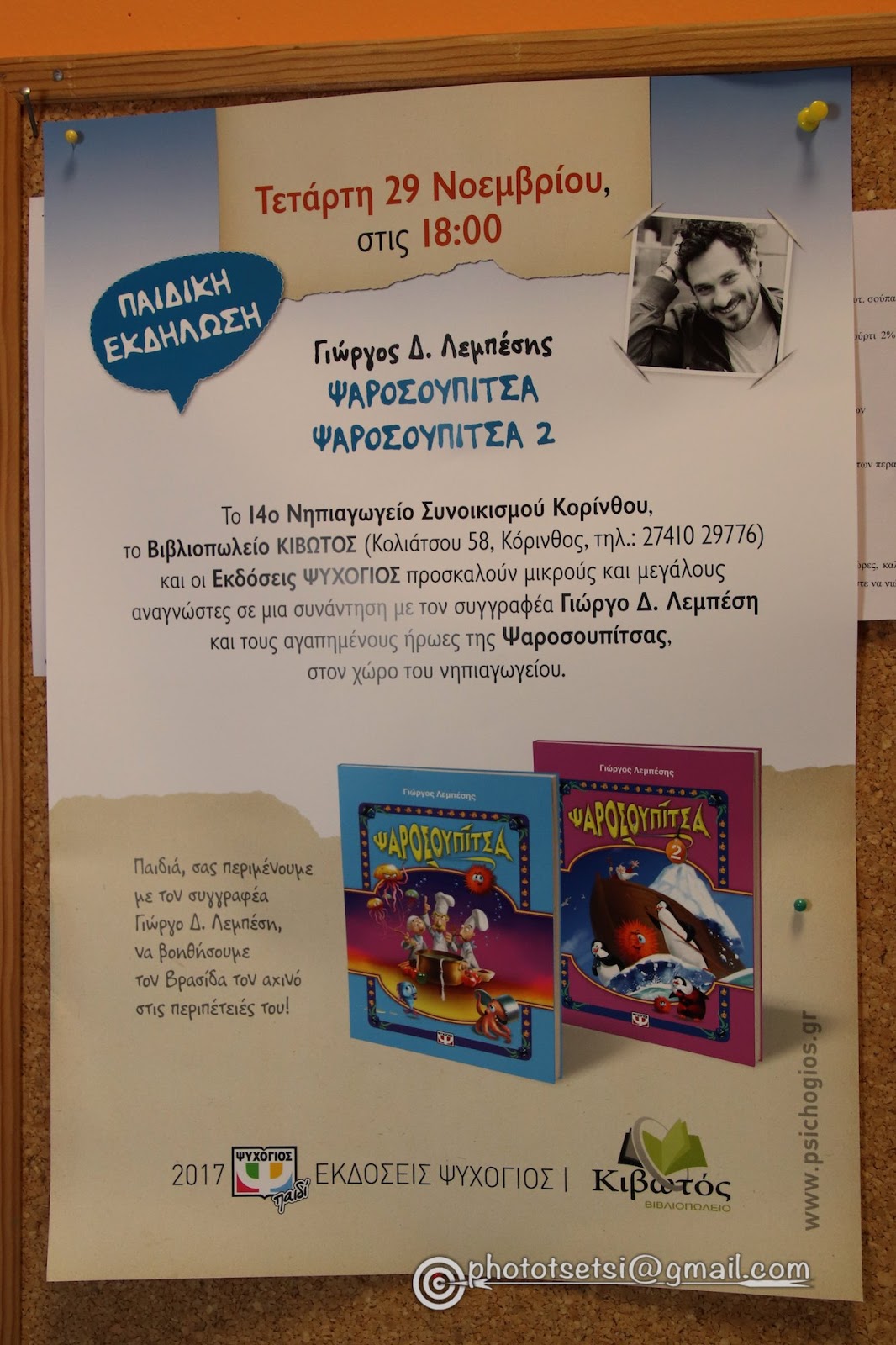 Την Τετάρτη 29 Νοεμβρίου 2017, στον όμορφο χώρο του 14ου Νηπιαγωγείου Συνοικισμού, το Βιβλιοπωλείο ΚΙΒΩΤΟΣ, το 14ο Νηπιαγωγείο Συνοικισμού και οι Εκδόσεις ΨΥΧΟΓΙΟΣ συνδιοργάνωσαν συνάντηση με τον συγγραφέα κ. Γιώργο Δ. Λεμπέση και τους αγαπημένους ήρωες της Ψαροσουπίτσας…