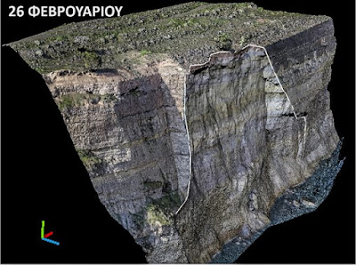 Από την επεξεργασία των τρισδιάστατων μοντέλων που δημιουργήθηκαν, οι όγκοι που αποκολλήθηκαν κατά την κύρια κατολίσθηση εκτιμήθηκαν σε 6000 κυβ. μέτρα ενώ κατά τη δεύτερη σε 700 κυβ. μέτρα. Στη συνέχεια παραθέτουμε εικόνες των τρισδιάστατων μοντέλων του πρανούς με επισήμανση των ορίων των αποκολλήσεων καθώς και μία εναέρια λήψη από παρόμοια οπτική γωνία θέασης.