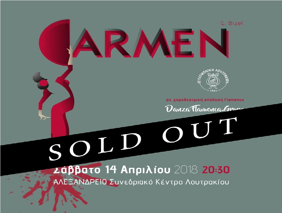 Εξαντλήθηκαν τα εισιτήρια για την παράσταση της Carmen που θα πραγματοποιηθεί το Σάββατο 14 Απριλίου και ώρα 20.30 στο Αλεξάνδρειο Συνεδριακό Κέντρο