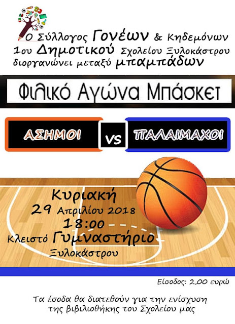 Την ερχόμενη Κυριακή 29/04 και ώρα 6 μμ. οι μπαμπάδες του 1ου Δημοτικού Σχολείου Ξυλοκάστρου παίζουν basket με στόχο να αναβαθμιστεί η βιβλιοθήκη του σχολείου μας.